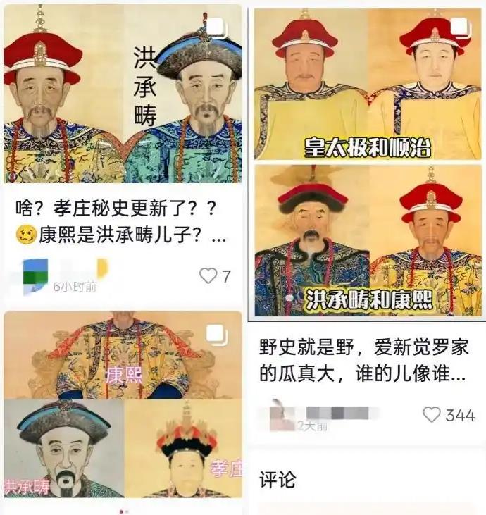 能够挑动吃瓜群众八卦心理的奇闻逸事总会飞速传播,这次轮到的是康熙。据中新社报道,一段时间以来,“康熙生父可能是洪承畴”的说法在网上广为流传,不少视频打出“惊天大瓜”等标签吸人眼球。视频提及孝庄太后与洪承畴私情,康熙避天花时被狸猫换太子等,煞有介事地拿出康熙与洪承畴的画像认为二人面貌相似,还解读《红楼梦》认为找出了证据,甚至有人就此延伸到乾隆皇帝和光绪皇帝也是汉人后裔,乾隆皇帝为海宁陈家之子。