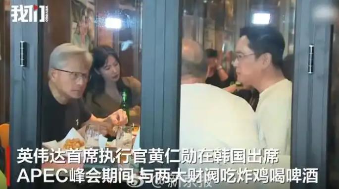10月30日,英伟达首席执行官黄仁勋在韩国出席APEC峰会期间,与两大财阀吃炸鸡喝啤酒。